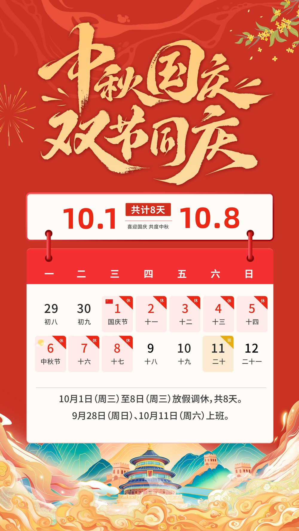 根據(jù)國(guó)家關(guān)于2025年節(jié)假日安排的通知精神,結(jié)合我司實(shí)際情況,現(xiàn)將國(guó)慶節(jié)放假安排及相關(guān)服務(wù)調(diào)整通知如下: